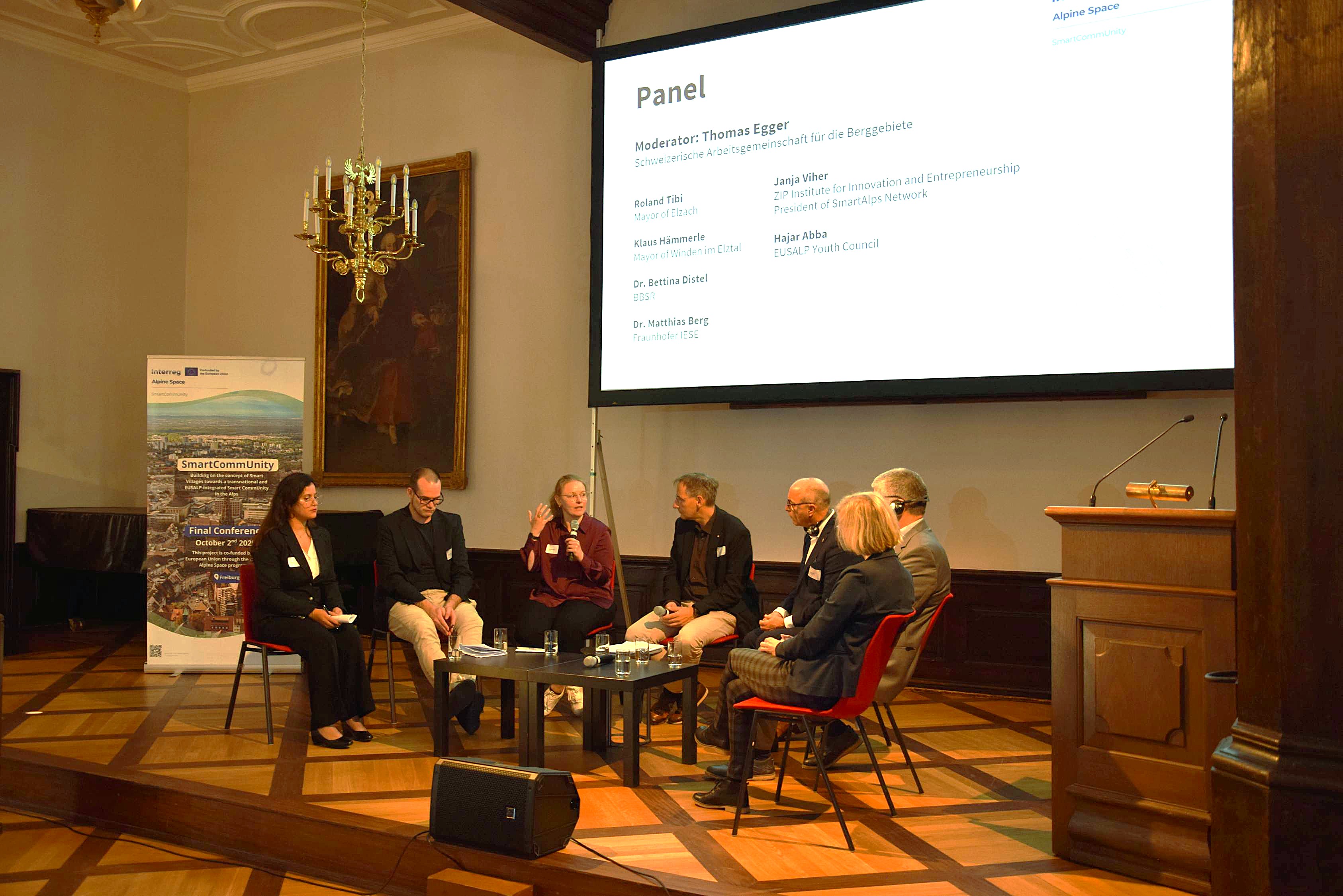 Am 2. Oktober fand die Abschlussveranstaltung des EU-Projekts SmartCommUnity im Historischen Kaufhaus in Freiburg statt. Gastgeber war der Verband Region Südlicher Oberrhein, der gemeinsam mit internationalen Partnern auf drei erfolgreiche Projektjahre zurückblickte. Dr. Bettina Diestel (BBSR) und Dr. Matthias Berg (Fraunhofer IESE) zeigten in ihren Impulsvorträgen auf, welche Potenziale digitale Technologien für die Entwicklung ländlicher Regionen bieten. Im Anschluss präsentierten Vertreterinnen und Vertreter der Projektregionen konkrete Ergebnisse und Best-Practice-Beispiele aus den Testgebieten. Im Mittelpunkt stand eine lebendige Podiumsdiskussion mit den Bürgermeistern von Elzach und Winden im Elztal, Vertreterinnen aus der Wissenschaft, der Präsidentin des SmartAlps-Netzwerks sowie einer Repräsentantin des EUSALP Youth Council. Gemeinsam blickten sie auf die Erfahrungen aus SmartCommUnity zurück und diskutierten Handlungserfordernisse und Perspektiven für eine smarte Entwicklung.