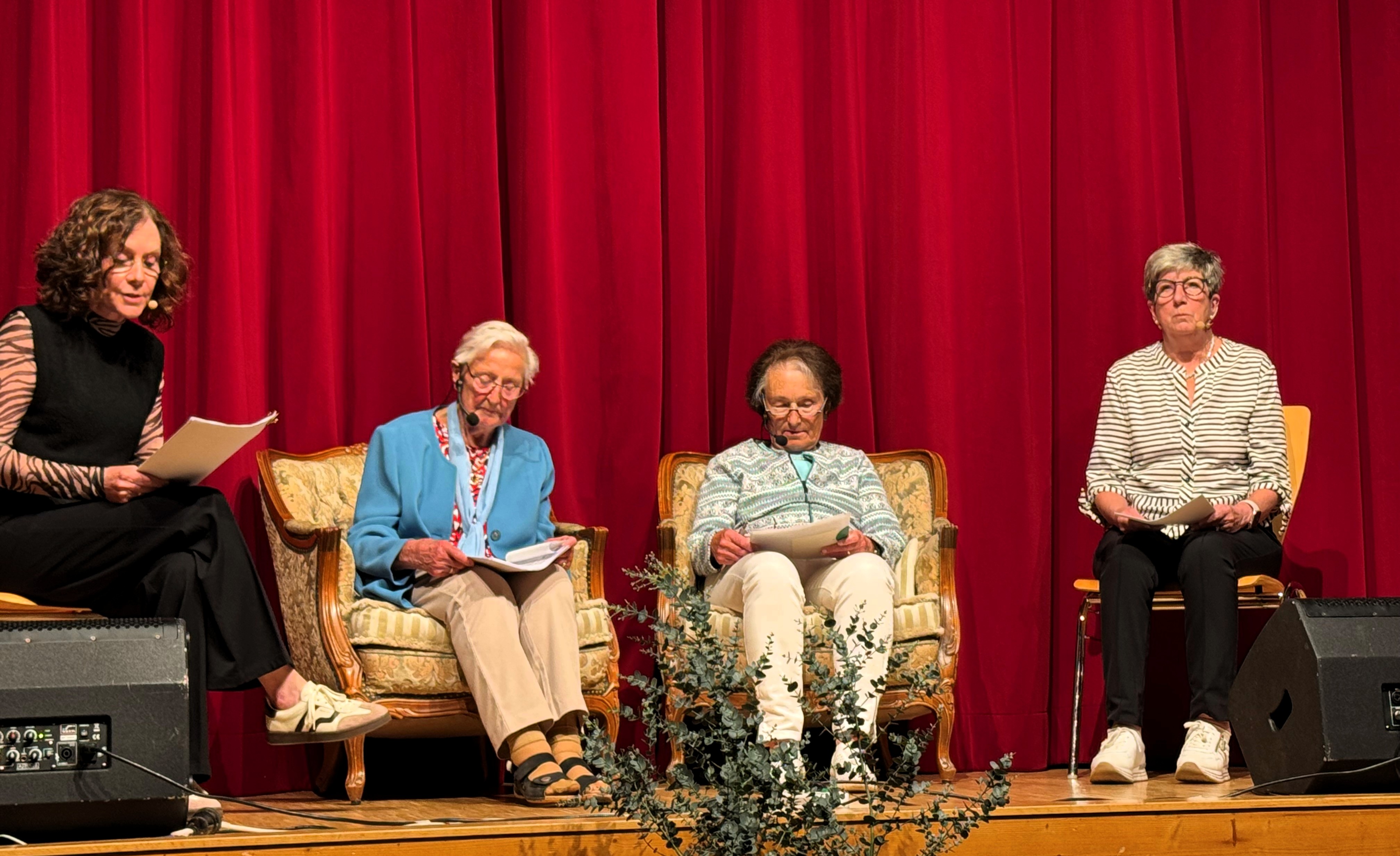 Besondere Aufmerksamkeit erhielten die Gründungsfrauen Bertl Bayer und Rosemarie Bechtold, die in einem Interview von den Anfängen und ersten Jahren der kfd Elzach berichteten. Moderiert wurde die Gesprächsrunde von Sabine Liebmann und Erika Hofmaier, deren Schwiegermutter vor einem halben Jahrhundert den Elzacher Ortsverein ins Leben rief. Mit einem Augenzwinkern erinnerten sich die 94-jährige Bertl Bayer und die 80-jährige Rosemarie Bechtold an vergangene Zeiten – etwa an das Jahr 1984, als die kfd-Frauen von der Narrenzunft Elzach gebeten wurden, das alte Krankenhaus für eine Tasse Kaffee zu fegen und zu wischen, damit es als Massenquartier für die vielen Narren genutzt werden konnte. Nach der Fasnet mussten sie die Arbeit, da es so gut funktioniert hatte, gleich noch einmal erledigen. Mit Charme und Witz nahmen die Frauen immer wieder auch das Patriarchat ins Visier.