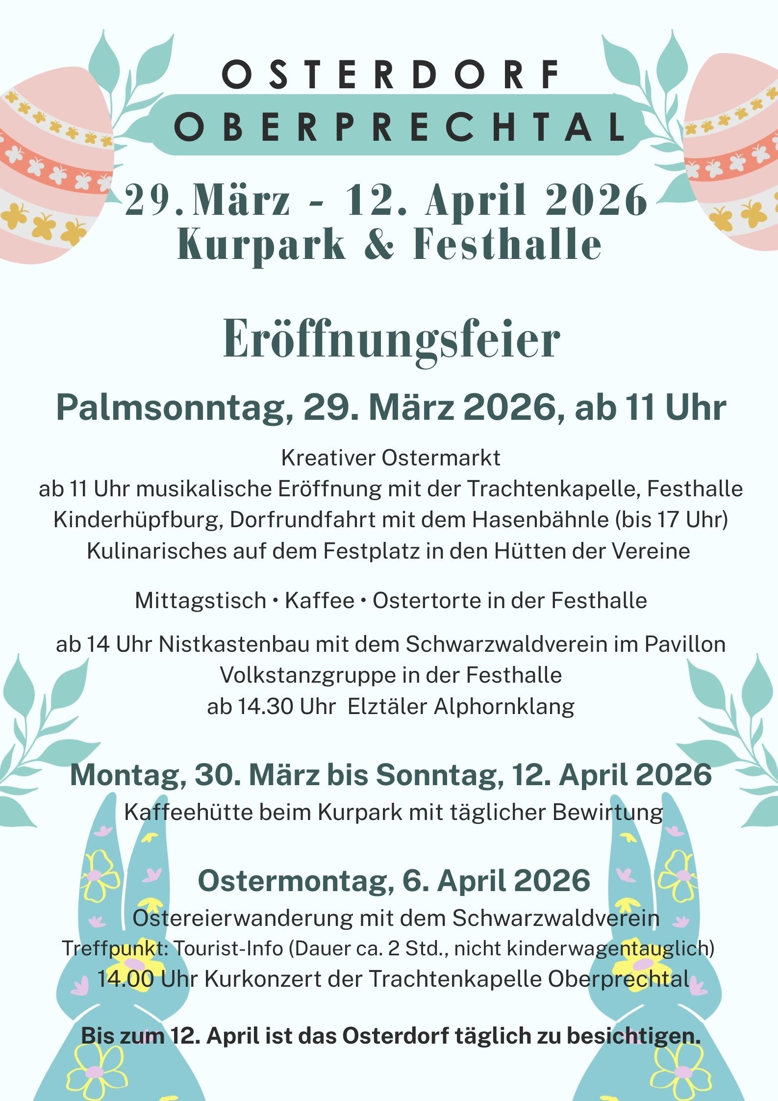 Traditionell wird das Osterdorf am Palmsonntag, den 29. März 2026 in der Festhalle eröffnet. Ab 11.30 Uhr werden die Gäste durch die Trachtenkapelle musikalisch begrüßt. Die heimischen Gastronomen der Café-Pension Endehof, Gasthaus zum Schützen, Schäck´s Adler, des ElzLand Hotel Pfauen und des Landgasthofs Rössle verwöhnen mit kulinarischen Köstlichkeiten zum Mittagessen.